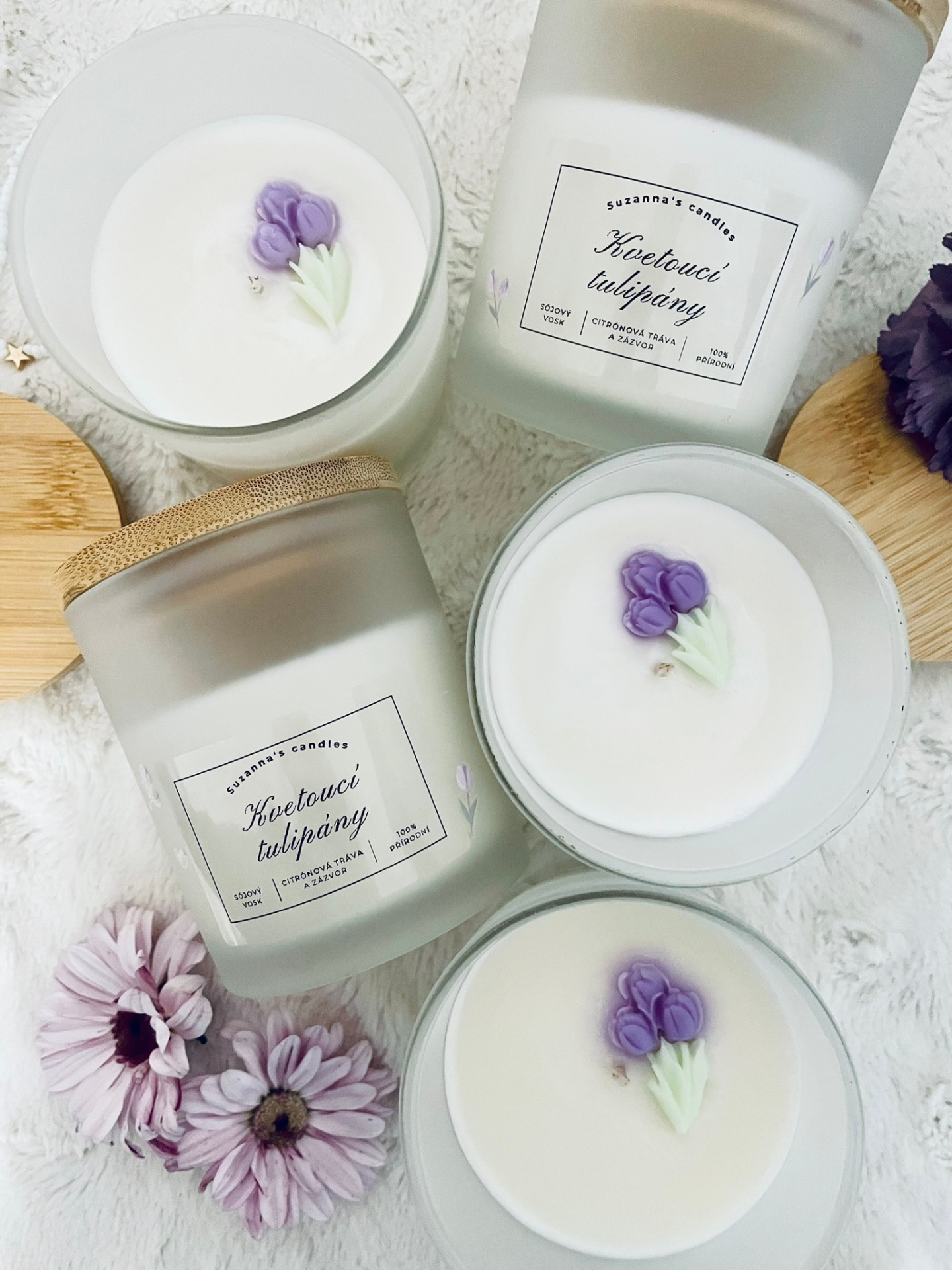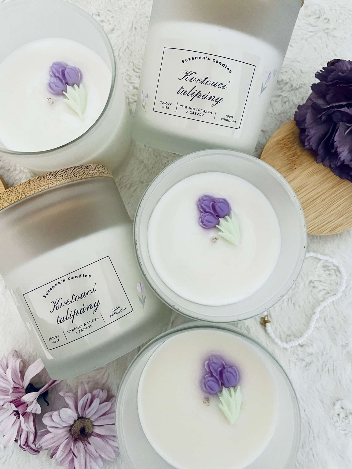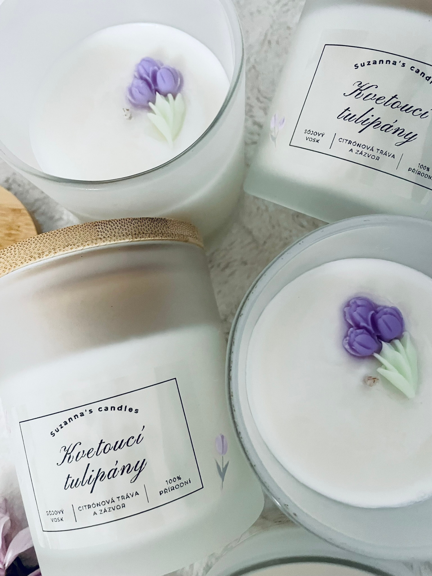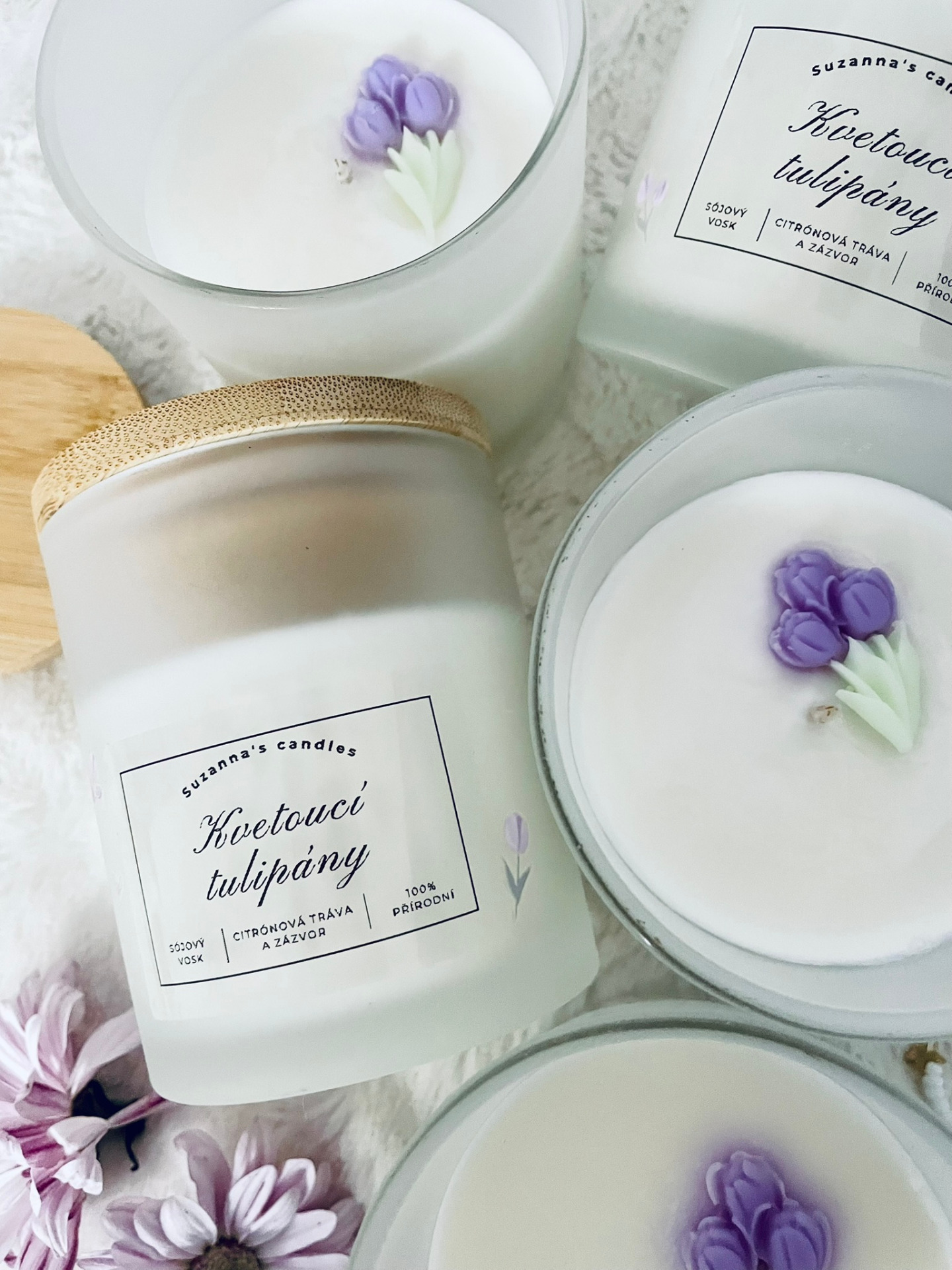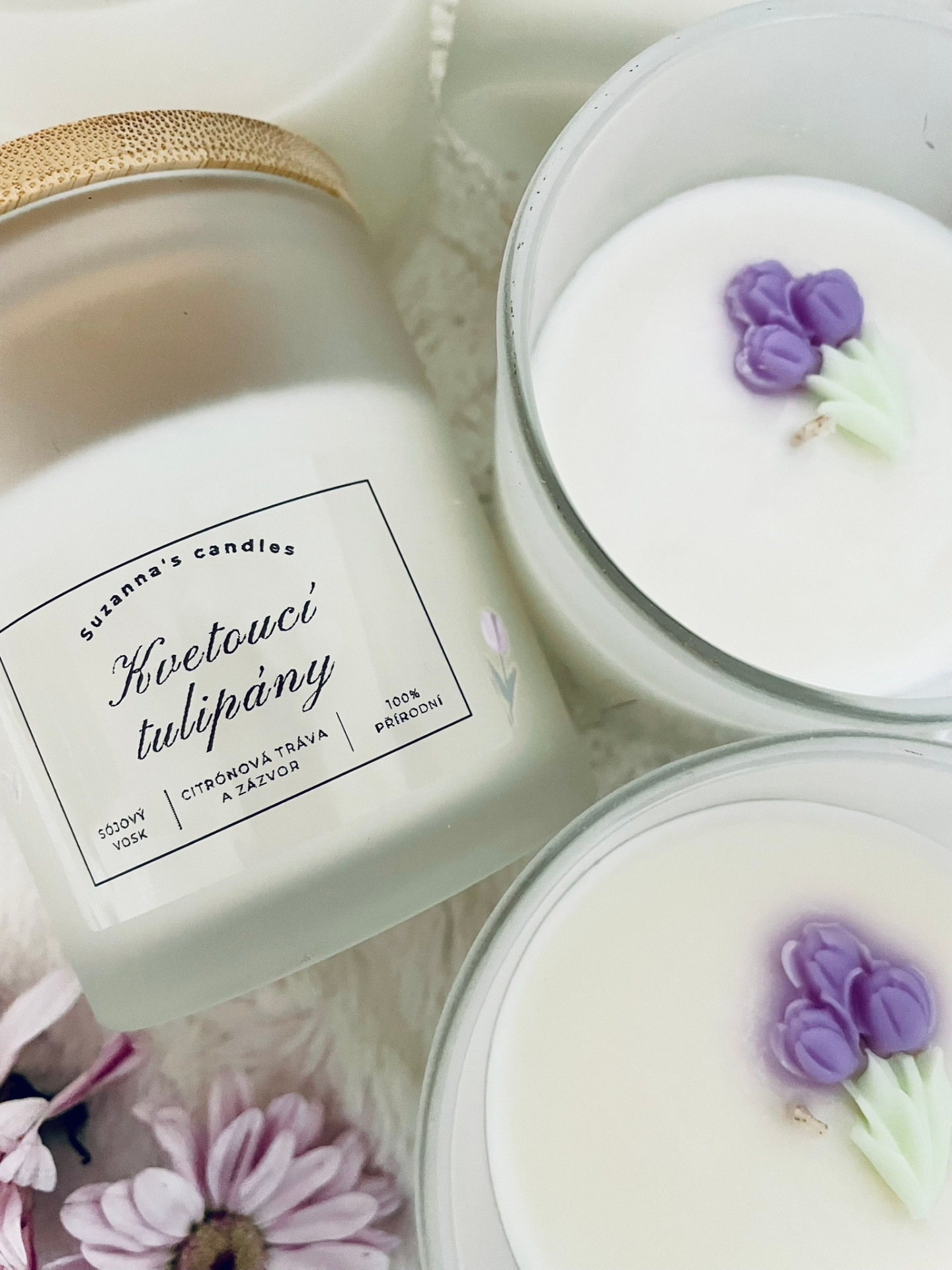 Popis svíčky: Přineste si do svého domova chvilku zpomalení s ručně vyráběnou svíčkou, která spojuje minimalistický design a jemnou ženskou energii. Matné sklo zdobí ručně nalepené mini tulipány, díky kterým svíčka působí něžně, čistě a elegantně.